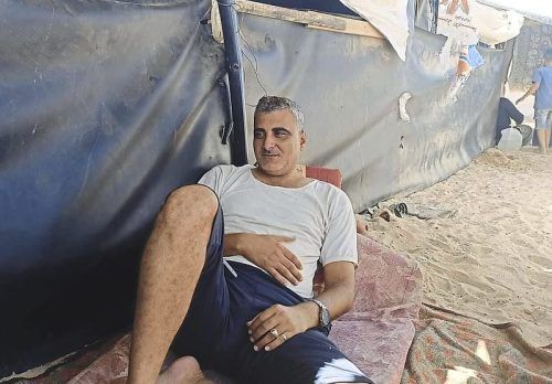 Ahmed Mduch im provisorischen und überfüllten Zeltlager in Deir al-Balah. Hier lebt er mit seiner Familie. © privat/dpa