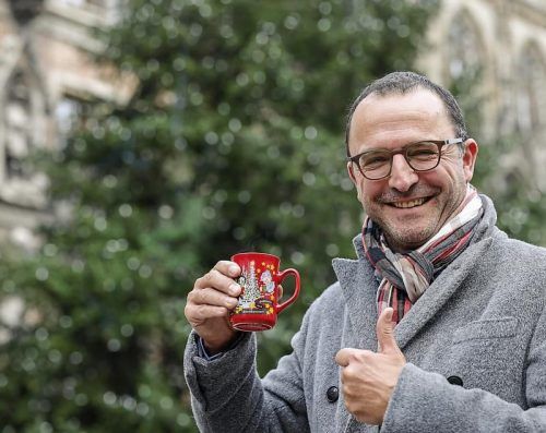 Freut sich auf den ersten Glühwein: Michael Reuss mit einer Tasse des nach altem Familienrezept gebrauten Trunks. © Stache