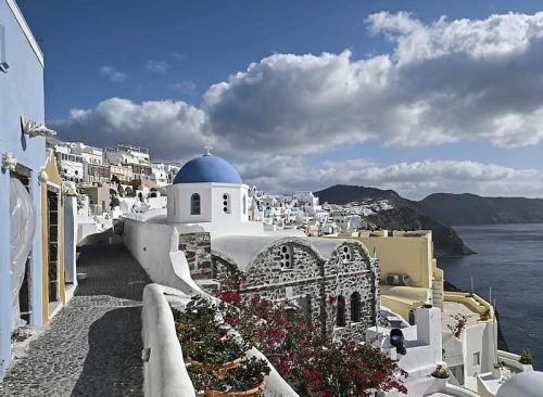 Unbeirrt malt eine chinesische Touristin auf einer Hotelterrasse auf der griechischen Vulkan-Insel Santorini im Sonnenschein. © Ferry Batzoglou