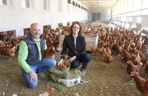 Viel Platz fürs Huhn: Thomas und Anita Haut in einem der Ställe. Auch ein Freil