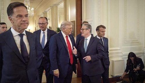 Was hat das Treffen gebracht? Nato-Generalsekretär Mark Rutte (v.li.), Bundeskanzler Friedrich Merz, Großbritanniens Premierminister Keir Starmer und Frankreichs Präsident Emmanuel Macron am Montag bei Donald Trump im Weißen Haus. © AFP