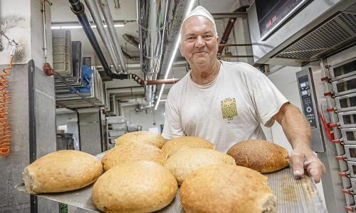 Alles noch echtes Bäckerhandwerk: Ludwig Neulinger zeigt ein Blech s