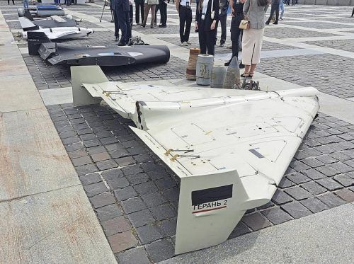 Abgeschossene russische Kampfdrohnen iranischer Bauart des Typs „Geran 2“ liegen auf dem Boden. © pa