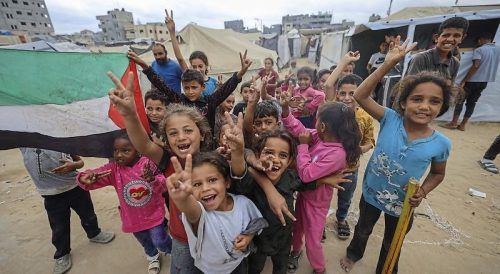 Palästinensische Kinder feiern in einem Flüchtlingslager im zentralen Gazastreifen. © Eyad Baba/AFP