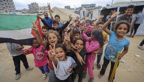 Palästinensische Kinder feiern in einem Flüchtlingslager im zentralen Gazastreifen. © Eyad Baba/AFP