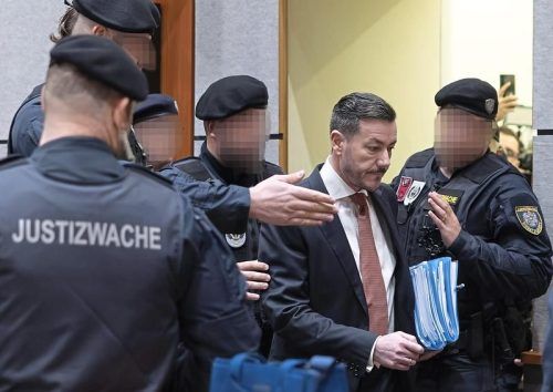 Die Justizwache bringt ihn an seinen Platz. Benko trägt viele Akten, sagt aber wenig. © Eibner