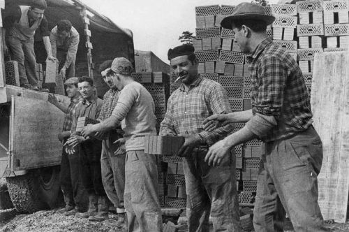 Bei der Arbeit: Italienische Immigranten auf einer Baustelle in der Nähe von München. © Jenö Kovacs/pa