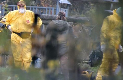 Unheimlicher Schnappschuss: Seuchenbekämpfer gestern am Gnadenhof in Germering. © Carmen Voxbrunner