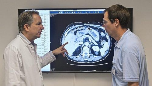 Fachübergreifende Besprechung: Chirurg Prof. Martin Angele (links) und Onkologe Dr. Till Seiler analysieren ein CT-Bild.