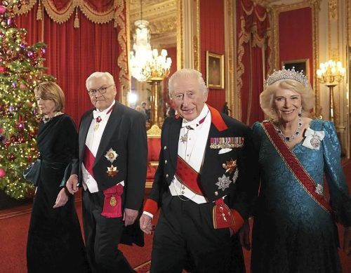 Der Bayer und die Prinzessin von Wales: Sebastian Roloff (li.) plaudert mit Kate, daneben Bundespräsident Steinmeier, König Charles und Außenminister Wadephul. © Carlos Jasso/AFP