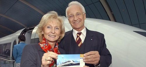 Karin und Edmund Stoiber 2003 nach einer Transrapid-Fahrt – auf der Auslandsreise nach China. Die Strecke dort: 33 Kilometer. Die Münchner Trasse war ähnlich, auf gut 37 Kilometer angelegt. © Ken Liu/dpa