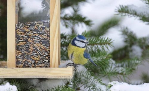 Eine Blaumeise an einer Futtersäule. Im Winter sind Vögel für jede Unterstützung dankbar. © imago