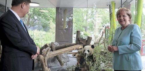 Seit Jahren Strategie: Präsident Xi Jinping 2017 mit Angela Merkel bei der Ankunft der Bären in Berlin. © SCHMIDT/AFP
