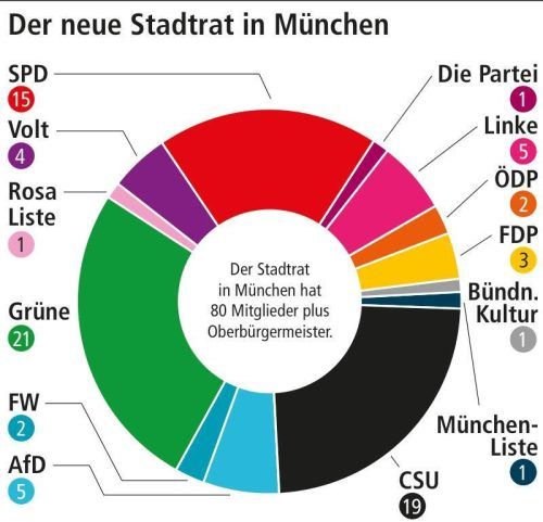 München – Einfacher wird es nicht im Münchner Stadtrat, Mehrheiten sind allenfalls hauchdünn oder umständlich möglich. Die Grünen verlieren zwei Mandate, bleiben aber stärkste Kraft mit künftig 21 Stadträten. Die SPD verliert drei Plätze, wird nur noch 15 Stadträte stellen. Besonders bitter ist die
