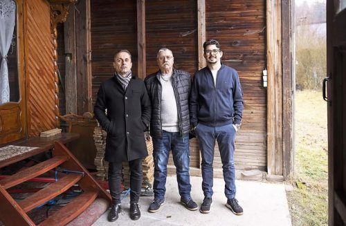 Robin Graf, Paul Graf und Patrick Röder (v.li.) stehen im Schuppen in Langenhaslach im Kreis Günzburg neben dem historischen Holzwohnwagen aus dem Jahr 1878. © Quirin Leppert