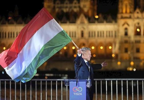 Historische Fotos: Peter Magyar schwenkt in der Wahlnacht eine Nationalflagge vor dem Parlament. Viktor Orbán hat klar verloren. © dpa/afp