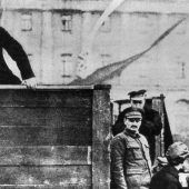 Mit und ohne TrotzkiDiese Retusche hat Lenin persönlich angeordnet: Auf späteren Versionen des Bildes fehlt der abtrünnige Leo Trotzki, hier rechts neben dem Rednerpult. zum Artikel