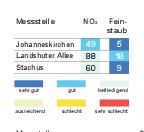 Das Bayerische Landesamt für Umwelt meldete gestern um 16 Uhr folgende Werte (Mikrogramm pro Kubikmeter; Feinstaub PM10: gleitender 24-Stunden-Mittelwert; Stickstoffdioxid: höchster 1-Stunden-Mittelwert im Zeitraum von 0 bis... zum Artikel