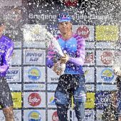 Dylan Groenewegen von den Unibet Rose Rockets (M.) jubelt nach seinem Sieg beim eintägigen Radrennen Bredene Koksijde Classic. © Waem/DPA