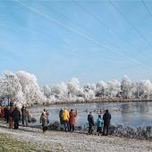 Bei einer Wassertemperatur von nur knapp über dem Gefrierpunkt musste erst einmal der Flossinger Weiher „enteist“ werden, bevor sich die rund 50 unerschrockenen Schwimmer in den See stürzen konnten. Foto Wagner zum Artikel