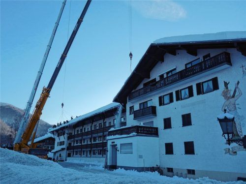 Weil es im Gebälk des großen Gebäudes bereits krachte, schickte das Landratsamt am Mittwoch die Helfer nach Reit im Winkl, um mit drei Kränen und einer Arbeitsbühne das Dach von Haus St. Sebastian zu räumen. 45 Soldaten der Bundeswehr waren laut Einsatzleiter Helmut Frohwieser damit beschäftigt, das