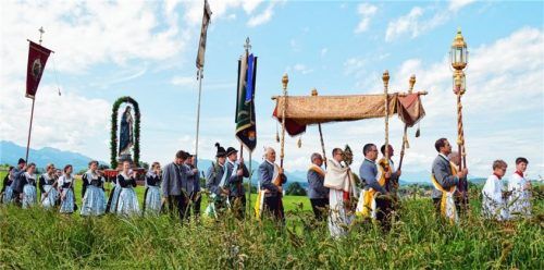Bei angenehmer Witterung zog gestern die Fronleichnamsprozession durch Breitbrunn. Bereits seit dem 13. Jahrhundert werden vielerorts vier Altäre in die vier Himmelsrichtungen aufgebaut, als Sinnbild für die Evangelisten Johannes, Lukas, Markus und Matthäus. Unser Bild zeigt die gläubigen Katholiken
