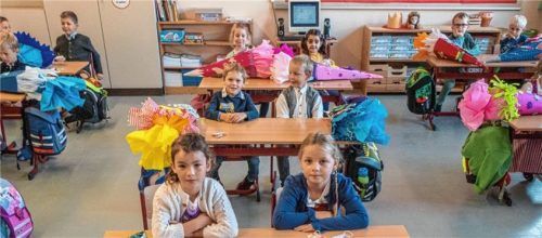 Vor dem Eingang der Turnhalle begrüßte Rektor Otto Manzenberger die 22 Erstklässler der Grundschule Unterwössen und ihre Eltern. „Ihr seid etwas Besonderes. Ihr seid die Ersten, die schon am ersten Schultag maskiert in die Schule kommen“, sagte der Rektor. Die Klasse 2b mit Klassenlehrerin Eva Maria