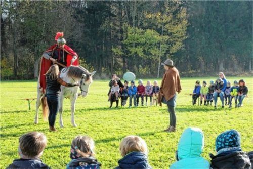 Schon am Vormittag trafen sich die Kinder vom Kinderhaus Eichet in Bernau zum Martinsspiel. St. Martin auf dem Pferd, dargestellt von Tom Hütter vom Pferdehof Jessica Emmerich, wurde mit Martinsliedern begrüßt und teilte dann seinen Mantel. Der Bettler wurde von Mitarbeiterin Carina Gasteiger darges