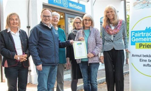 Prien ist Fair-Trade-Gemeinde und das seit mittlerweile vier Jahren. Nun übergab Bürgermeister Andreas Friedrich (Zweiter von links) der Gemeinderätin und Initiatorin Angela Kind und ihrer Steuerungsgruppe die erneut ausgestellte Urkunde im Weltladen in der Geigelsteinstraße. Dafür habe sich die Mar