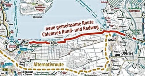 Ab sofort führt der Chiemsee Rund- und Radweg ab der Gemeindegrenze Übersee, von Grabenstätt kommend, entlang der Autobahn bis nach Bernau-Felden und schließt dort wieder an den bestehenden Chiemsee Rund- und Radweg an. Vereinfacht ausgedrückt: Die neue Route verläuft somit auf der bisherigen Altern