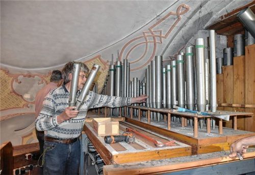 Endlich ist es soweit, die alte Orgel in der Pfarrkirche St. Remigius wurde abgebaut, ein Ereignis, das man selten beobachten kann. Orgelbauer Alois Linder (Foto, links) und Uli Skiwan aus Nußdorf sind angereist und haben mit sechs Helfern aus Schleching die Orgel abgebaut und nach und nach in das E
