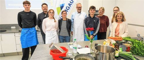 Sichtlichen Spaß beim Zubereiten des Gemüserisottos im Beisein des Traunsteiner Landrat Andreas Danzer hatten die Schüler Lena Lamminger, Emil Schubert, Jakob Lehmann und Lisa Brach. Meisterkoch Andreas Kessler gab zum Auftakt der Workshop-Initiative „Junge Köche“ in der Franz-von-Kohlbrenner-Mittel
