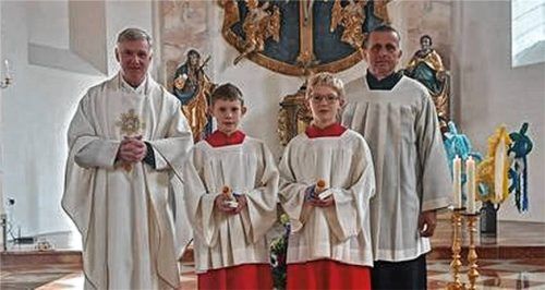 Mit Leonhard Hipper und Mathias Speicher wurden beim Gottesdienst am Kirchweihsonntag zwei neue Ministranten in der Reit im Winkler Pfarrei St. Pankratius eingeführt. Er freue sich, wenn junge Menschen sich zum Dienst am Altar bereit erklären, so Pfarrer Martin Straßer. Er segnete die Dienstplakette