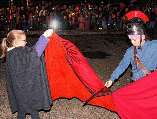 Unzählige Laternenkinder zogen zusammen mit ihren Eltern durch die Straßen. Voller Stolz präsentierten sie dabei ihre Laternen und folgten dem auf einem Pferd sitzenden Sankt Martin. Auf dem Platz neben der Turnhalle wurde anschließend die Geschichte des „Mantelsteilens“ mit dem Bettelmann nachgespi