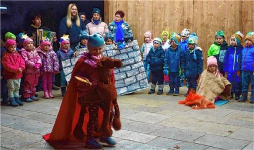 Zum Martinsfest lud das Kinderland Rottau ein und 50 Kinder des AWO-Kindergartens und des Waldkindergartens kamen beim Kindergarten zusammen. Die Feier begann mit dem Lied „Kommt, wir woll`n Laterne laufen“. Dann kam St. Martin zu Ross und führte den Zug von Kindern mit ihren schönen Laternen und vi