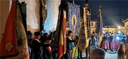 Die Fahnen der Grabenstätter Ortsvereine senkten sich. Dann erschallten drei Salutschüsse aus der Kanone. Zuvor hatte es nach dem Kirchenzug eine Messe in der Pfarrkirche gegeben. Den Gottesdienst zelebrierte Pater Andrei Mirt und die Kapelle spielte auf. Foto Müller
