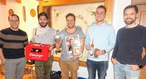 Voll besetzt war beim heurigen Atzinger Preisschafkopfen das Florianstüberl der Feuerwehr Atzing im Vereinshaus. Das beste Blatt für den neuen Besitzer des Wanderpokals nach zweimal 30 Partien hatte dabei Anton Hötzelsperger junior (Mitte, 101 Punkte) aus Bachham vor Florian Aß aus Thansau (Zweiter
