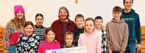 Die „Rembocher Klöperlkinder“ haben den Erlös ihrer Aktion nun der Kinderkrebshilfe Berchtesgadener Land und Traunstein gespendet. Insgesamt sammelten die Buben und Dirndl 1.316 Euro, die im Beisein von Jugendleiterin Franziska Gartner (links) und ihres Stellvertreters Martin Schmalzbauer (rechts) a
