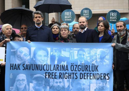 Begleitet von Protesten vor dem Gericht hat in Istanbul der Prozess gegen den deutschen Menschenrechtler Peter Steudtner begonnen (das Banner zeigt ihn als Zweiten von rechts unten). Zum Auftakt wies der Angeklagte sämtliche Terrorvorwürfe der Staatsanwaltschaft zurück. Steudtner sitzt seit 18. Juli