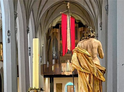 In der Osterzeit steht die Statue des auferstandenen Christus mit der Siegesfahne im Altarraum unserer Kirche. Anders als die Gottesdienstbesucher in den Bänken, sehe ich die lebensgroße Figur von meinem Platz aus aber immer nur von hinten. Doch genau diese Perspektive ist mir in den letzten Jahren