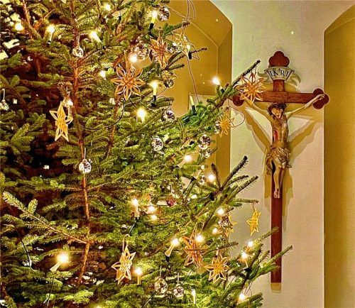 Von meinem Platz im Altarraum aus sehe ich unseren Christbaum nur von der Seite. Plötzlich fällt mein Blick auf das große Kreuz, das an der Wand daneben hängt. Es ist das Kreuz, das ich am Karfreitag in der Karfreitagsliturgie einmal um den Kirchenraum trage. Behutsam, weil es zum einen so groß und