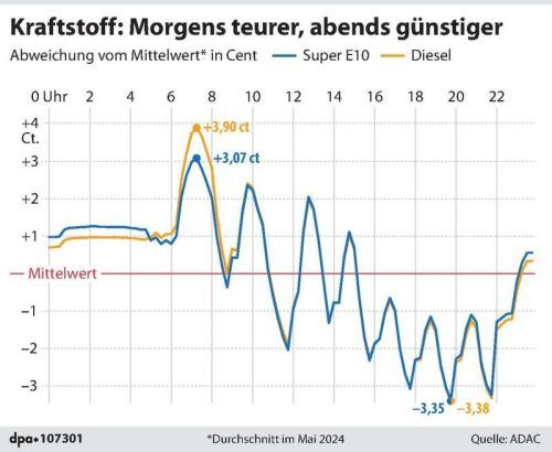 Die Schwankungen der Spritpreise im Tagesverlauf werden zwar schneller, aber auch kleiner. Der Abstand zwischen dem höchsten und niedrigsten Preis im Tagesverlauf war einer aktuellen Auswertung des ADAC zufolge im Mai etwas niedriger als noch vor einem Jahr. Konkret waren es 6,4 Cent bei Superbenzin