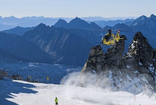 Die Rettung Pistenunfälle kann sehr aufwendig und teuer werden, vor allem, wenn der Helikopter kommen muss. Hier: Eine Rettungsaktion am Hintertuxer Gletscher in Tirol. © Tom Nebe/dpa