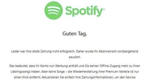 Großer Schreck beim Überfliegen des Postfachs: Angeblich wurde das Spotify-Abo pausiert. Der Grund soll eine überfällige Zahlung sein. Doch keine Panik – die Mail ist nicht echt. Betrüger wollen damit nur an sens