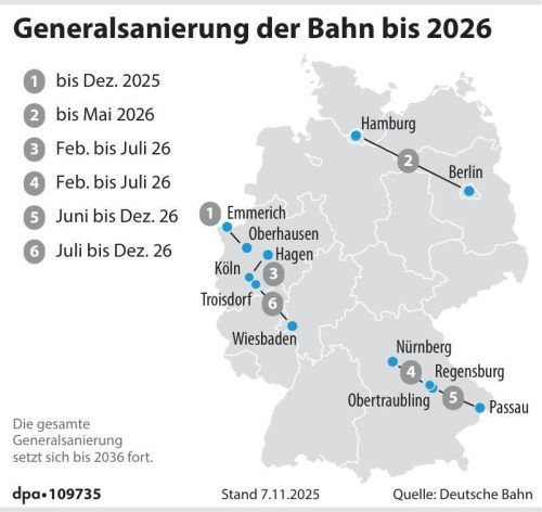 Monatelang nur Ersatzbusse für Pendler, spürbar längere Fahrzeiten bei Fernzügen: Die Bahn beginnt im Februar mit der Sanierung der wichtigen Strecke von Köln über Wuppertal nach Hagen. Vom 6. Februar bis zum 10. Juli wird der 65 Kilometer lange Abschnitt für den Fernverkehr komplett gesperrt. Das h