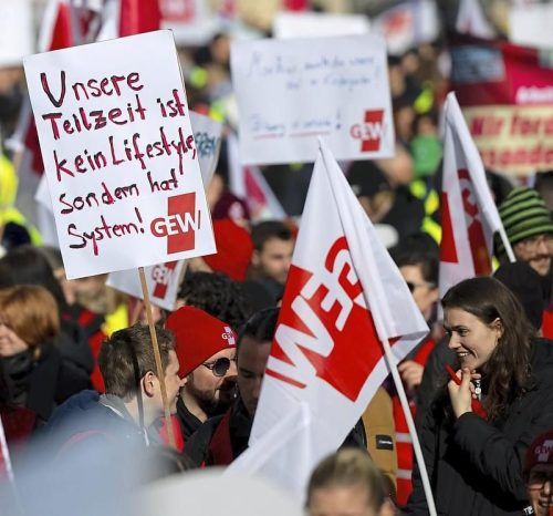 „Unsere Teilzeit ist kein Lifestyle, sondern hat System!“, steht auf einem Schild bei dem Warnstreik in München. Das Thema wird emotional diskutiert. © Sven Hoppe/dpa