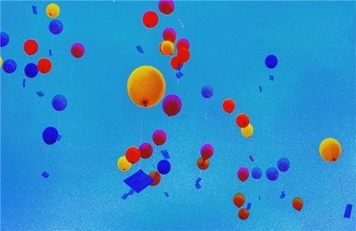 Bunte Hoffnungszeichen: Luftballons mit angehängten Karten steigen in den Himmel. Foto Jansco