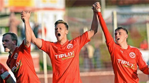 Riesenjubel bei 1860 Rosenheim nach dem 3:2-Derbysieg gegen Burghausen. Nach einer super Leistung vor allem in der zweiten Halbzeit drehten die Sechziger das Spiel nach einem, 0:1-Rückstand mit drei Toren innerhalb von 14 Minuten. Auf dem Bild von links Max Mayerl, Matthias Heiß, der nach langer L
