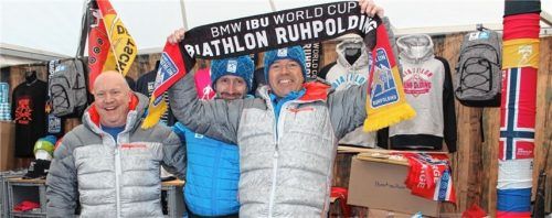 Der Andrang im offiziellen Fanshop ist riesengroß – und das Interesse an Mützen, Schals, Caps oder Pins dürfte noch weiter steigen. Markus Jäger (links): „Das neue Design unserer Artikel gefällt den Fans.“ 15 ehrenamtliche Helfer stehen ihm zur Seite, täglich hat er neun Mann im Einsatz.Foto Seifert