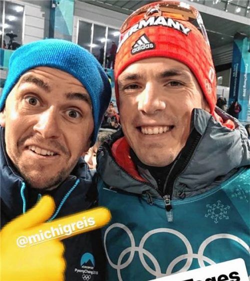 Spannender geht’s kaum, beim Massenstart der Biathleten hat das Zielfoto entschieden. Am Ende gewann der Franzose Martin Fourcade Gold vor Simon Schempp vom Stützpunkt Ruhpolding. Einer der ersten Gratulanten war der dreifache Olympiasieger von Turin 2006, Michi Greis (links), der als Co-Kommentator